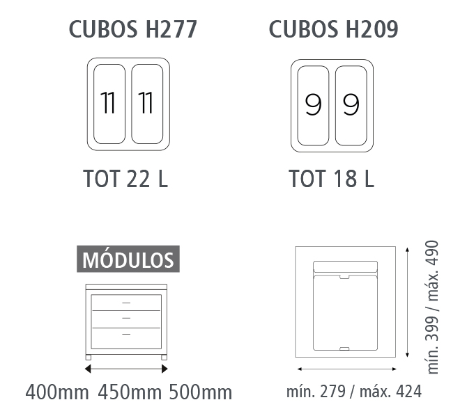 Base cubos de basura, sistema 9XL. Para módulos de 400, 450 500 milímetros.