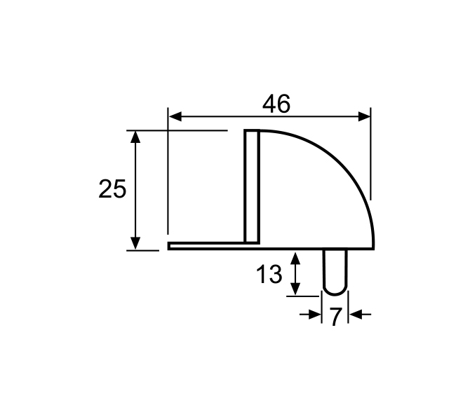 Tope para puerta de zamak, ½ bola con goma negra. Medidas: Ø46-H25 mm.