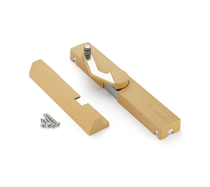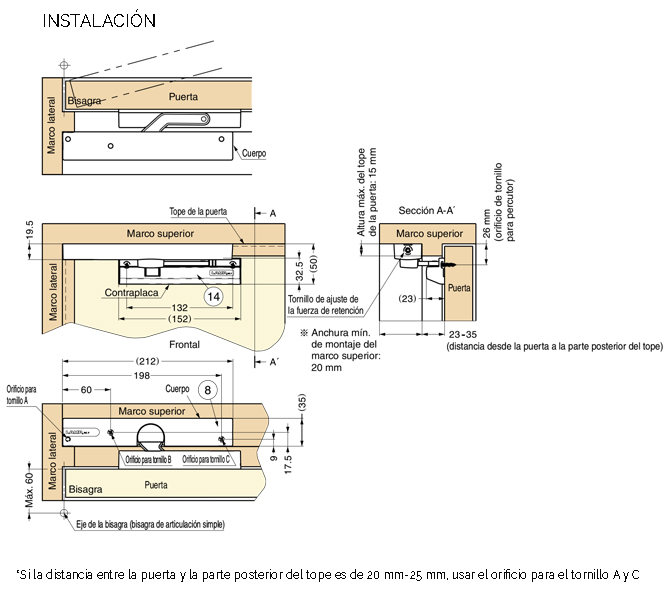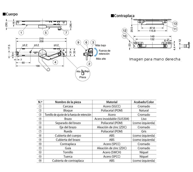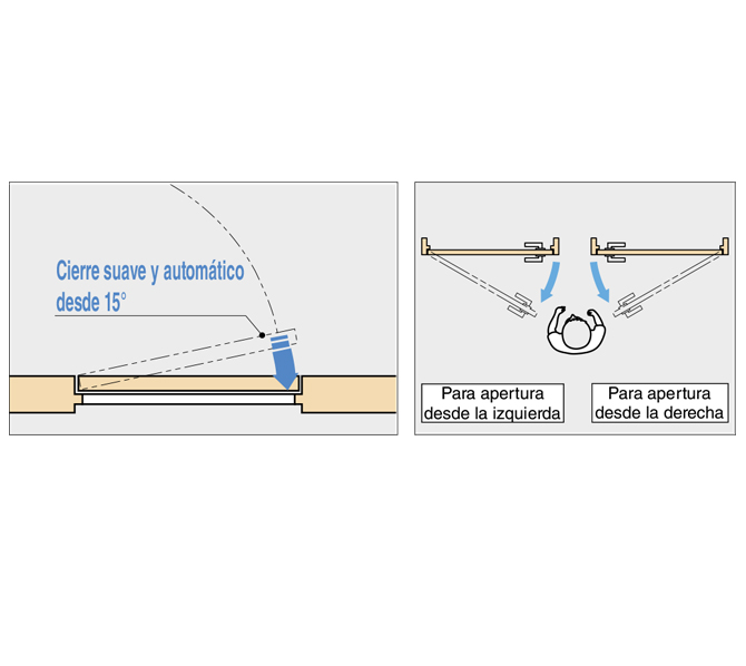 Amortiguador sobreponer para puerta izquierda. Material: Acero-ABS-inox. Medida: 210x33 mm. Cierre automático y suave desde 15º.