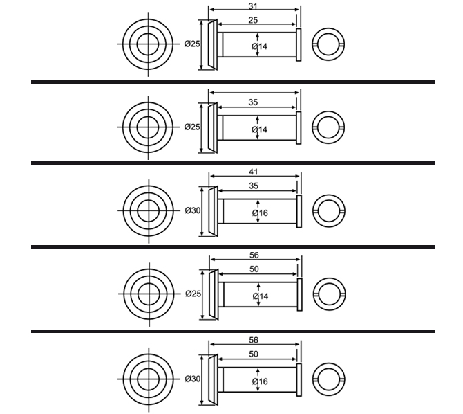 Mirilla de latón con tapa, de 15-25, 14 mm, 25-42, 14 mm, 35-60, 14 mm y 35-60, 16 mm, 60-85, 14 mm y 60-85, 16 mm.