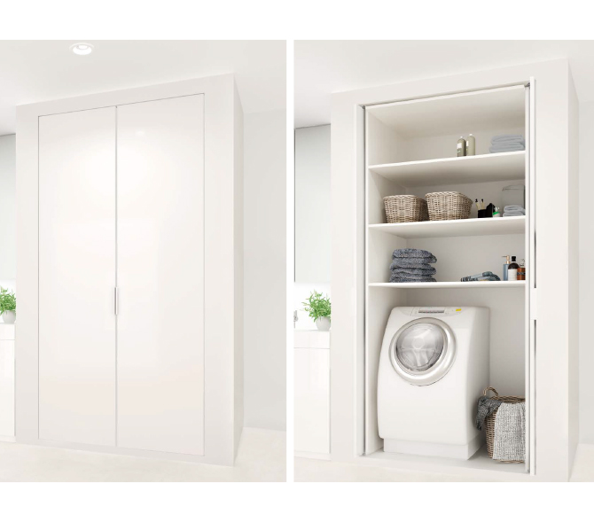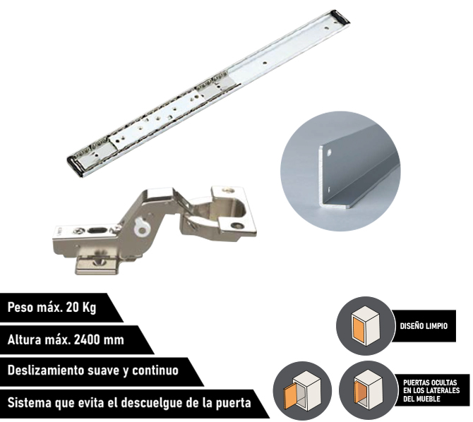 Nuevo y optimizado sistema para ocultar las puertas en los laterales de los muebles y armarios. Este kit de bisagras, barras y guías, ideados para puertas de hasta 2400 mm de altura y 20 Kg de peso, se ha desarrollado y mejorado, para un deslizamiento suave y continuo, evitando también el descuelgue de la puerta.