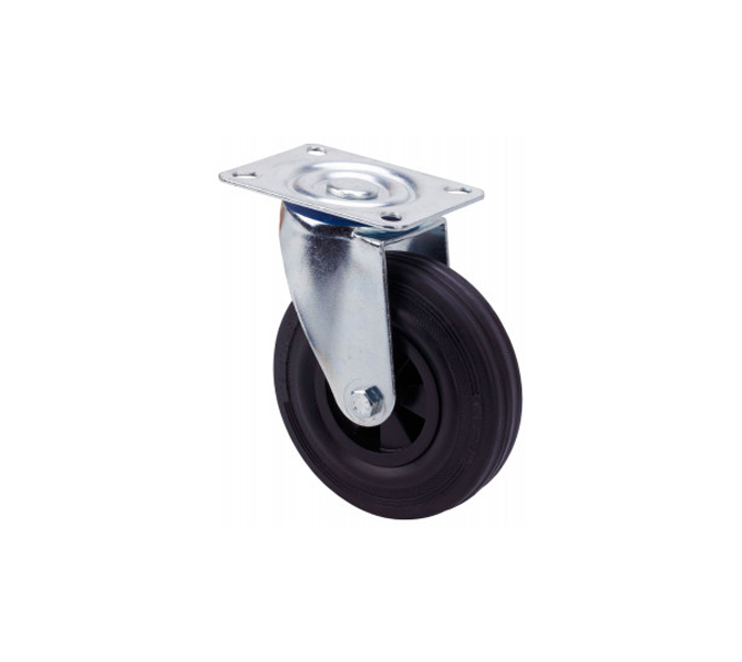 Ruedas de goma negra natural. Especialmente indicada para soportar cargas hasta 200 Kg. Se aplica en carros de herramientas, carros tubulares, logística interna, gradas móviles, útiles de transporte, plataformas elevadoras, talleres, carros de transporte de alimentación, cocina, cantina, comedor, restáurate, factorías de alimentación, logística material misiones, transporte de útiles, compresores, escaleras, barredoras, pulidoras, soldadura, hormigoneras, grúas, maquinas de embalaje, cintas transportadoras, grúas móviles, remolques, maquinaría ligera, ebanisterías, cerrajerías, carpinterías metálicas, granjas agrícolas, contendores de basura, contenedores, roll-tainers, roll-palets, jaulas de transporte.