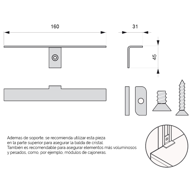 Juego de soporte para balda de cristal Stíli. Kit 2 unidades. Elemento de fijación para estanterías de cristal. Incluye tornillo y elemento de fijación a barra vertical. Las estructuras modulares Stíli son una solución elegante y sencilla, que dan originalidad a cualquier ambiente, tanto en áreas comerciales como tiendas y oficinas como en ámbitos residenciales. Por su gran versatilidad se pueden integrar en múltiples entornos, como vestidor a la vista en un dormitorio, estantería a medida y separador de ambientes en un salón o mueble organizador en cocinas y baños. Todo de manera fácil y sin obras, combinando los distintos elementos y creando composiciones a medida.