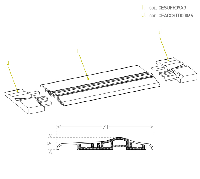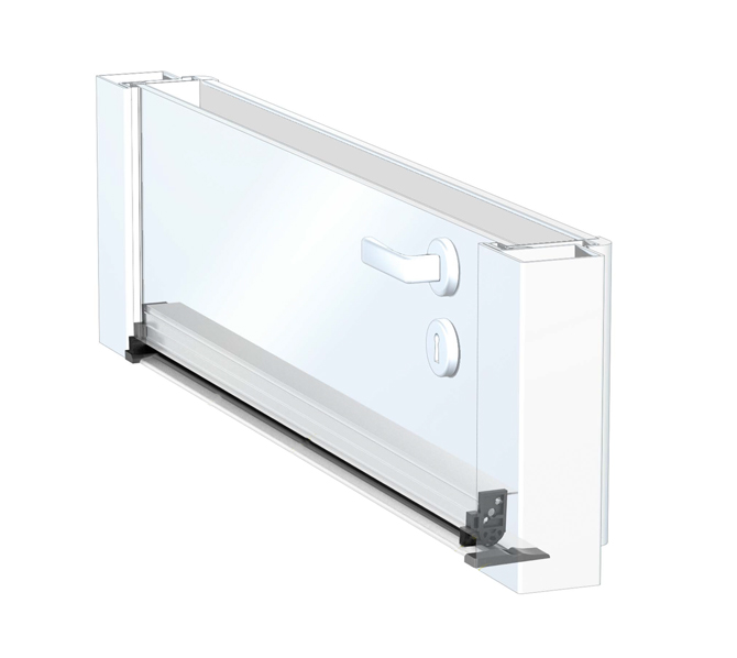 Zócalo para puerta. Certifica la carpintería para estanqueidad al aire, agua o viento y aprovechar el corte térmico en PVC para tener baja transmitancia, en puertas de 1 ó 2 hojas. Todo con un solo sistema. Los terminales laterales y las juntas centrales del umbral de suelo y de la junta de debajo de la puerta se dimensionan según las especificaciones técnicas de la carpintería del cliente.