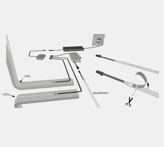 Tira de luz flexible, autoadhesiva, modelo Versa Plus 60, para uso universal. Compatible con perfiles ChannelLine. Presenta cable de alimentación bilateral (un corte, dos luces). Entre sus características destacan la baja altura de construcción y acortable individualmente. Es un producto sucesor de Versa Plus.